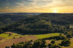 Eine hügelige Region in Nordrhein-Westfalen mit dichten Wäldern, Seen und malerischen Dörfern.